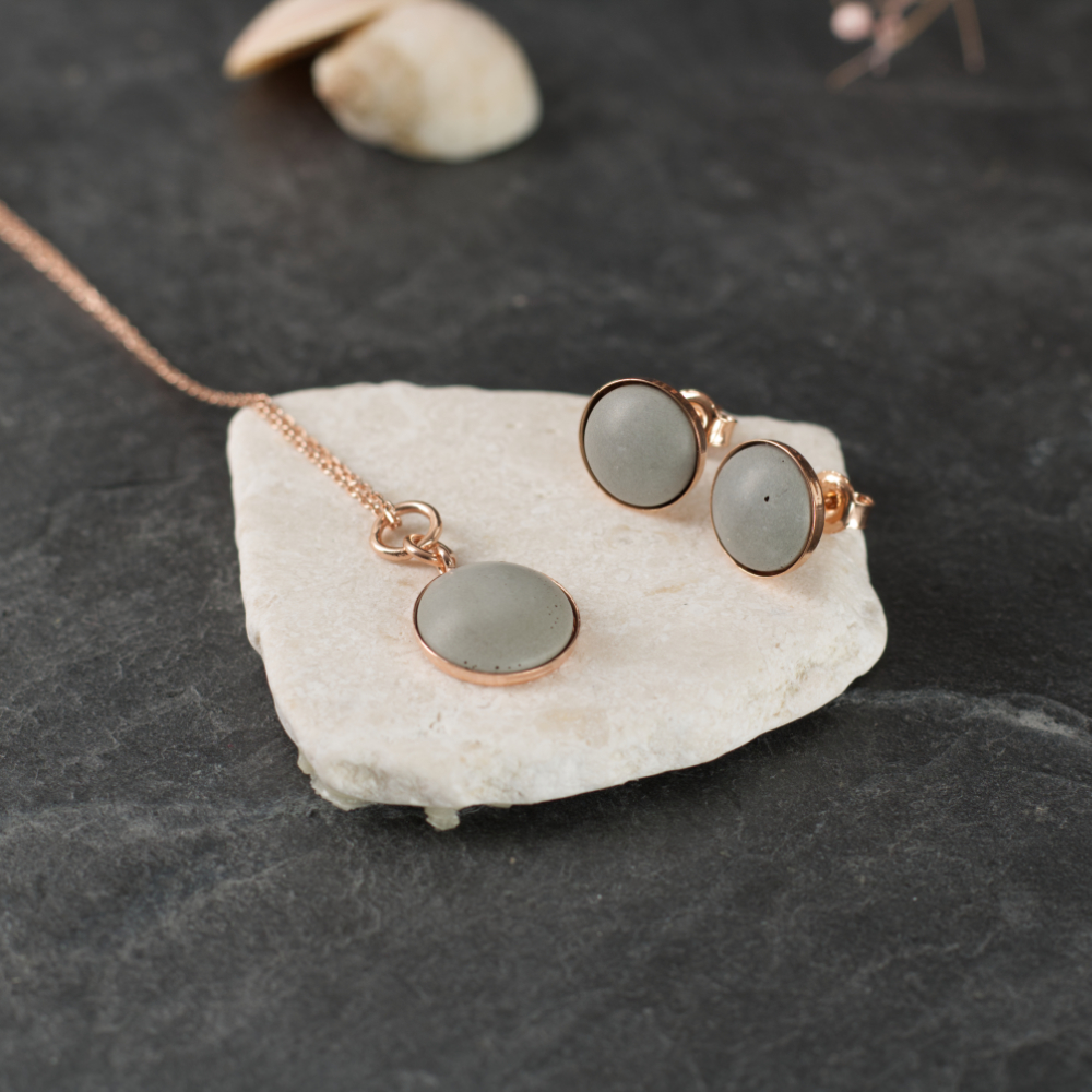 Beton eingebettet in Fassungen der Ohrstecker von 10mm Ø und einer Anhängerfassung Ø12mm gefertigt aus 925 Sterling Silber vergoldet 18 Karat, plattiert, nickelfrei und Anlaufschutz.