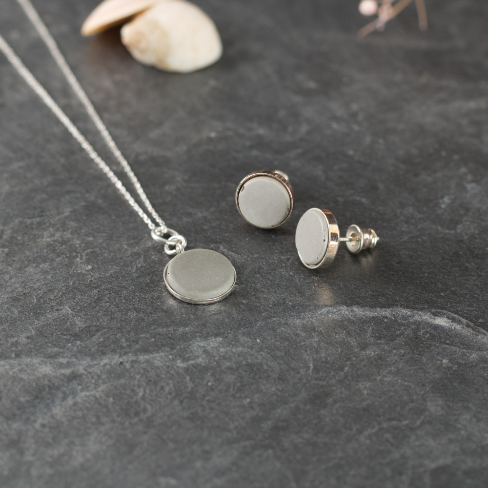 Beton eingebettet in einer Fassung mit Öse gefertigt aus 925 Sterling Silber, nickelfrei, aus europäischer Produktion.
