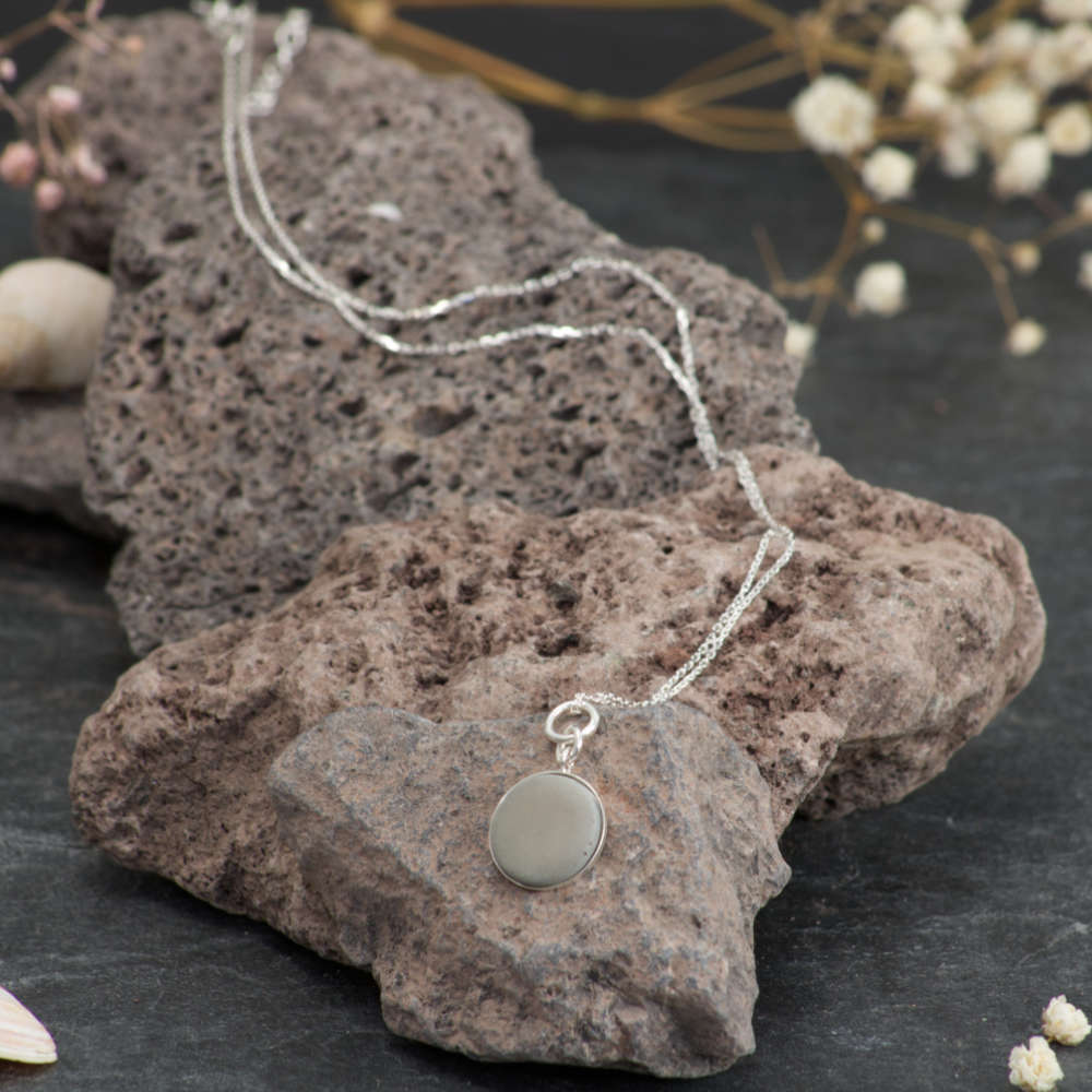 Cool und chic, grau, schlicht und charmant flach, diese Halskette ist ein einzigartiger Blickfang. Unser Betonschmuck in seiner schlichtesten und pursten Form. Die Optik ist glatt und samtig, ohne Veredelung und dennoch nobel. Die Formen sind filigran oder voluminös. Sehr hoher Tragekomfort. Hergestellt aus Ultrahochfestem Beton, 100% Handarbeit aus unserem Atelier in Berlin. Eingelassen in einer Fassung mit Öse gefertigt in Europa, aus 925 Sterling Silber, nickelfrei.