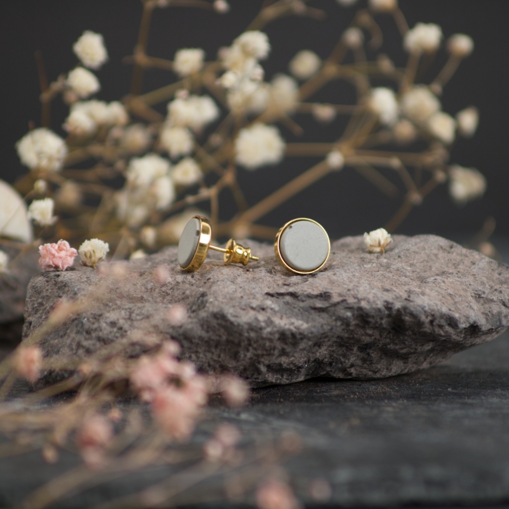 Beton eingebettet in einem Ohrstecker gefertigt aus 925 Sterling Silber vergoldet 18 Karat plattiert, nickelfrei, aus europäischer Produktion.