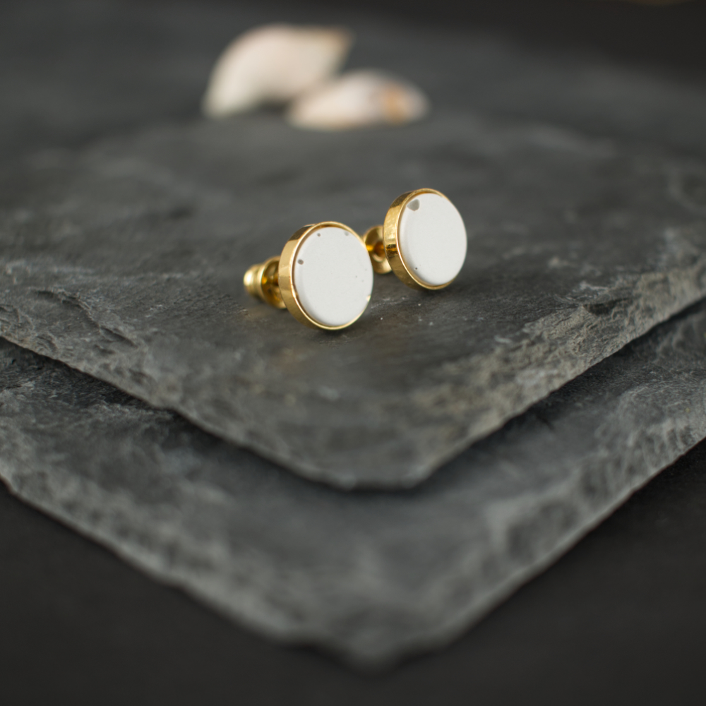 Cool, weiß, schlicht, charmant und flach, ein einzigartiger Blickfang. Unser Betonschmuck in seiner schlichtesten und pursten Form. Die Optik ist glatt und samtig, ohne Veredelung und dennoch nobel. Die Formen sind filigran oder voluminös. Hergestellt aus Ultrahochfestem Beton, 100% Handarbeit aus Berlin. Eingelassen in einer Fassung der Ohrstecker gefertigt in Europa, aus 925 Sterling Silber, vergoldet 18 Karat plattiert, nickelfrei, mit Anlaufschutz.